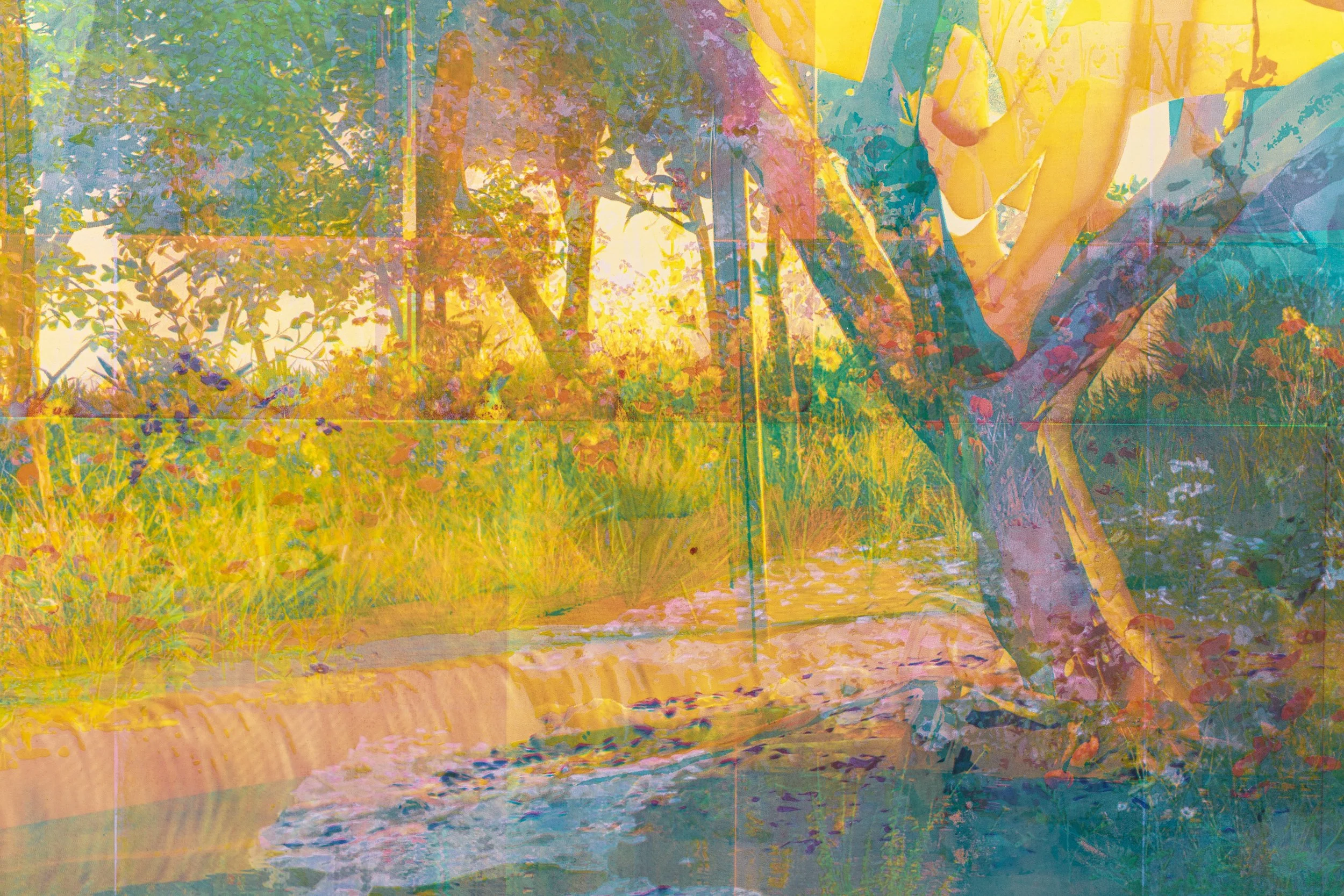 Walsh foregrounds the tensions between photography, virtual space, and painting to propose a visual language that is synthetic and sensuous at once. Their compositions begin in 3D-modeled environments—constructed outdoor scenes populated by archival and staged figures—which are then reconfigured through layered silkscreen and painting processes. The resulting images shimmer with dissonant cues and, through their multiple exposures, material misalignments, and dissolving contours, coalesce into surfaces that feel both intimate and estranged. These are not landscapes in the traditional sense, but temporal and affective fields that hold space for indeterminacy.
